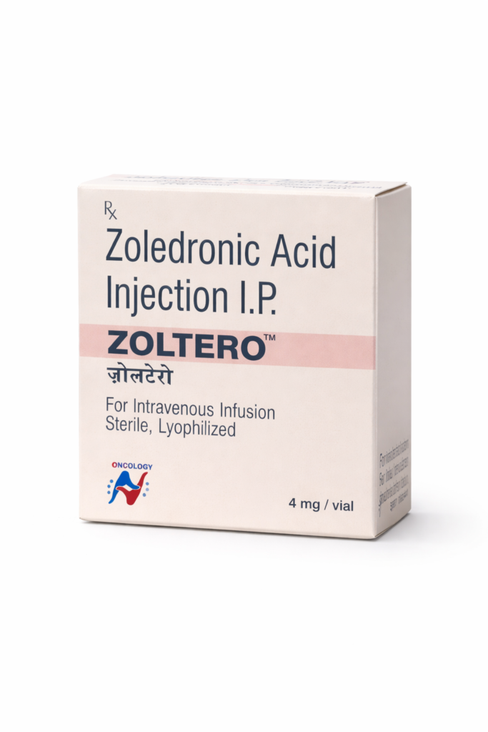 Zoledronic Acid Injection 4 mg is a potent intravenous bisphosphonate used in oncology for the management of bone metastases, multiple myeloma, and hypercalcemia of malignancy. It reduces skeletal-related events such as fractures and spinal compression while improving bone strength in cancer patients.